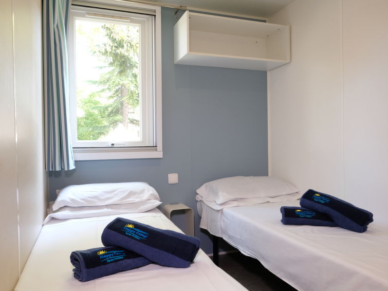 "Happy Premium", 4-kamers mobilhome 30 m2. Comfortabel ingericht: woon-/eetkamer met elektrische verwarming en air-conditioning. 1 kamer met 1 2-pers bed (140 cm, lengte 190 cm). 2 kamers, elke kamer heeft 2 bedden (70 cm, lengte 190 cm). Open keuken (4-pits kookplaat, magnetron, diepvriezer, elektrische koffiemachine). Douche/WC. Terras gedeeltelijk overdekt. Terrasmeubelen, elektrische barbecue (verrijdbaar), ligstoelen (2). Ter beschikking: klamboe. Parkeerplaats (1 Auto) bij het huis. Niet rokers woning. IT074002B100024512