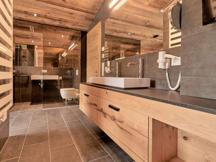 "Bergsteiger - Chalet", chalet 5-kamers 120 m2 op 2 verdiepingen. Hal. 1 kamer met 1 bed, 1 2-pers bed, douche/WC en Sat-TV (Flatscreen TV). Groot woonkeuken (oven, afwasmachine, 4 keramische glas kookplaten, diepvriezer, elektrische koffiemachine) met eethoek en Sat-TV (Flatscreen TV). Uitgang naar het terras. Bovenverdieping: 2 2-pers. kamers, elke kamer heeft 1 2-pers bed en Sat-TV (Flatscreen TV). Bad/douche/WC, dubbele wastafels. Groot terras. Terrasmeubelen, ligstoelen. Mooi panoramazicht op de bergen en de plaats. Ter beschikking: sauna, haardroger. Internet (WiFi, gratis). Maximaal 1 huisdier/hond toegestaan. Rookmelders. Als er minder dan het maximale aantal gasten in de accommodatie verblijft, zijn niet alle wooneenheden beschikbaar voor gebruik.
